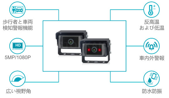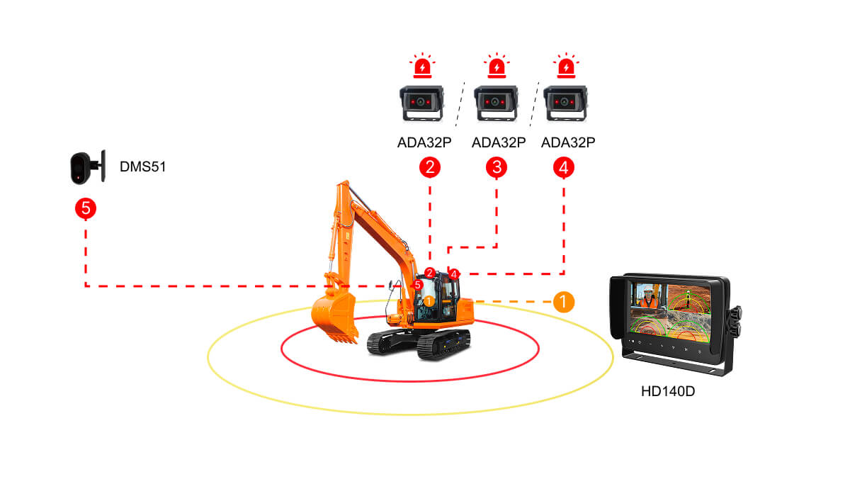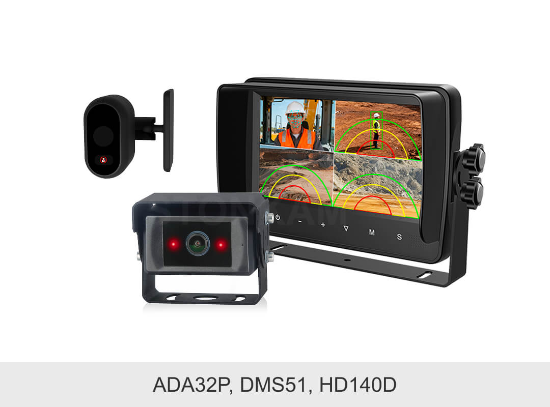 STONKAM 歩行者・車両検知機能付きAI搭載建設機械カメラシステムには、AI盲点監視カメラが車両の前方、側方、後方の歩行者と車両をリアルタイムで検知します。DMS運転行動監視カメラと組み合わせて、疲労、脇見、通話などの不安全運転行動が同時に検知可能です。潜在的なリスクを検知すると、システムは速やかに音と光による警告を発し、ドライバーに安全措置を講じるよう促し、車内外の全面的な運転安全を実現します。