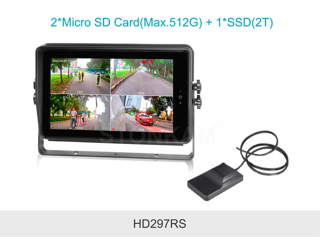 STONKAM® 10.1インチ歩行者&車両検出&警告インテリジェント車載ビデオ監視モニターは、ディープラーニング技術を採用し、4チャンネルAI歩行者&車両検出&警告アルゴリズムを内蔵し、四分割画面360°死角なし監視し、車両の周りの歩行者や車両のリアルタイム検出することを実現し、潜在的なリスクをドライバーに警告し、衝突を回避し、安全運転を支援します! 同時に、このモニターはGPS/Wi-Fi/4Gを内蔵しており、外部DVRなしで、HDリアルタイムビデオ録画と自動ループ録画を実現できます。大容量ビデオストレージを備え、フリート管理の効率と安全性を向上させます。 また、IP66防水をサポートし、雨や雪の日でも正常に動作することができます。